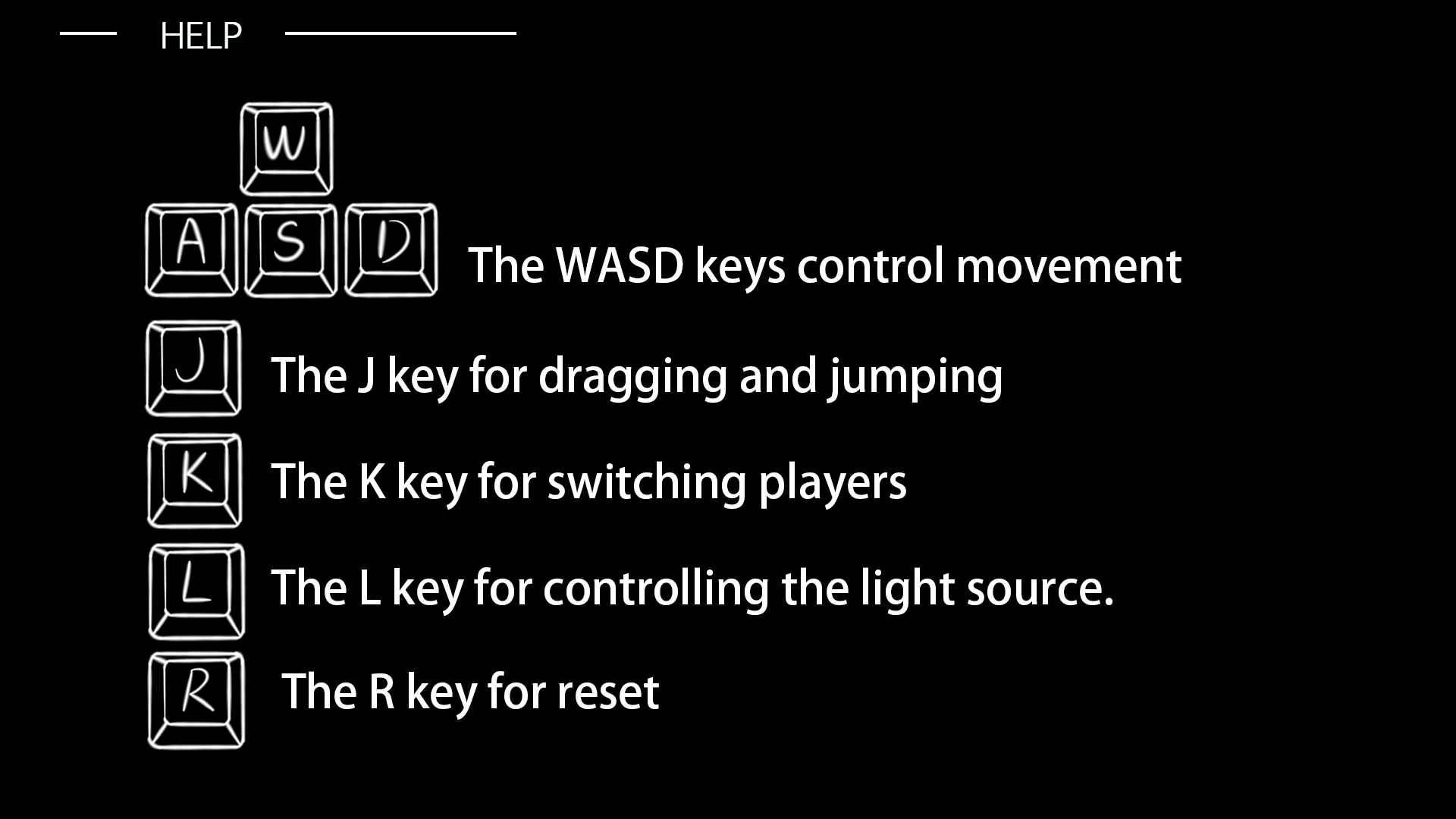 In the abandoned ruins, the protagonist who can emit light by itself and a shadow existing in the wall meet. Then, through cooperation in solving puzzles, they overcome various small obstacles and receive certain rewards. The light source of the protagonist projects light and combines with the obstacles to project shadow platforms on the wall for the shadow to pass through. The shadow presses the buttons and mechanisms on the wall to open the obstacles (doors/other obstacles) in front of the protagonist on the plane, and the two cooperate to complete the game and finally achieve each other's salvation: they coexist and thrive together.
